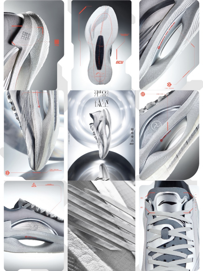 李宁䨻绝影「钛空」,继续搭载李宁弜减震回弹科技、李宁䨻轻弹科技、GCU全天候止滑科技、双层异构碳版、Coolshell清爽透气科技五大李宁品牌核心科技,在“减震、轻量、回弹、减少耗能、减少运动损伤”五重定义之上,解构“钛空”元素。金属钛色的碳板犹如能量引擎,每一步如“钛空”飞步般回弹感受;金属光泽感的李宁LOGO与线条呼应鞋面、鞋舌、鞋带以及后跟处不同层次的银色配色方案,如银翼跑者在“钛空”漫步。