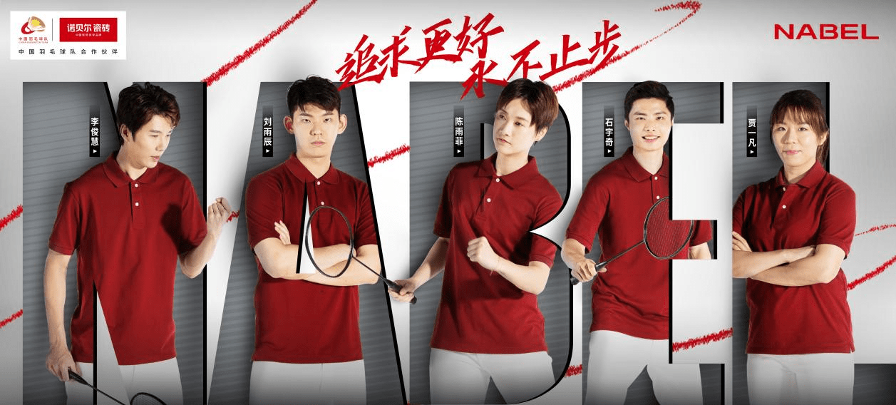Never +Amazing+Better+Energy+Love 组成了今天的NABEL,也诠释了诺贝尔品牌不断开拓创新,科技铸就产品的理念,也注解了中国国家羽毛球队的精神内核。